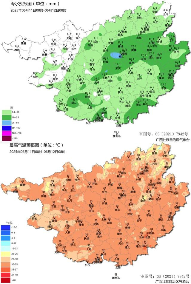 降水预报:6月11日14时至12日14时,广东中西部沿海、广西沿海、海南岛大部、西沙群岛等地有大雨,其中,海南岛中东部的部分地区有暴雨或大暴雨(100~150毫米)。