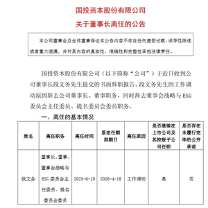 6月10日晚间,A股上市公司国投资本发布公告,因工作调动原因,段文务辞任公司董事长等系列职务。