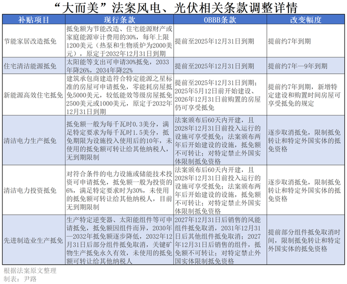 风能、光伏相关的补贴调整比较复杂,住宅清洁电力相关的补贴调整幅度最大,节能家居改造、户用光伏以及新能源住宅项目的税收抵免都提前至2025年底到期,至少提前七年。