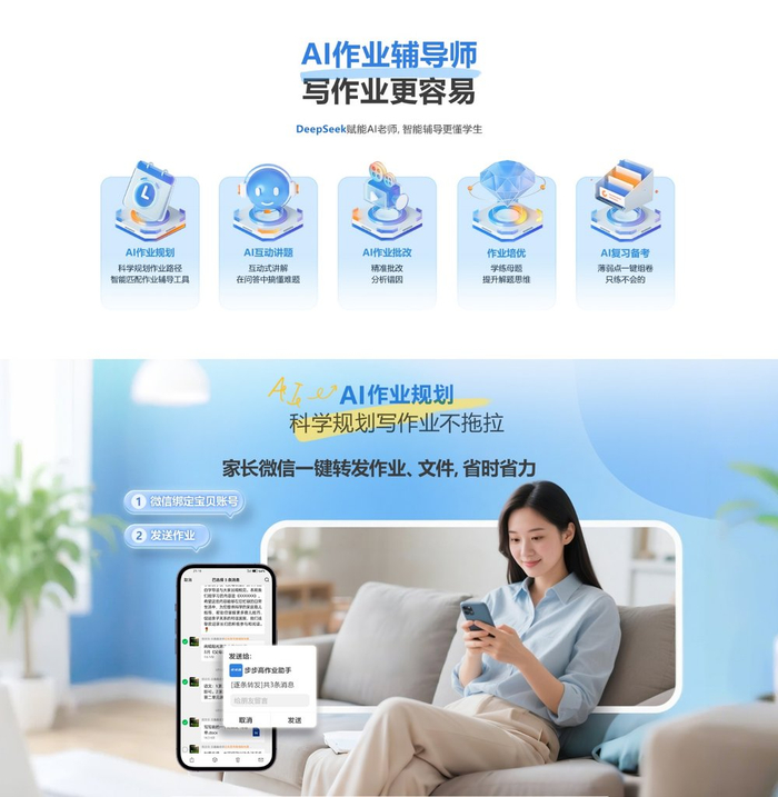 AI作业规划:家长微信一键转发作业,AI自动规划解题路径并精准匹配辅导工具。学生可通过AI互动式讲解攻克难题,作业完成后AI智能批改、溯源错因、关联母题,并由清北名师视频解析,真正实现“做一题,通一类”。支持AI智能规划课程与复习备考,精准诊断学情弱点,定制个性化提升方案,让学习有的放矢。
