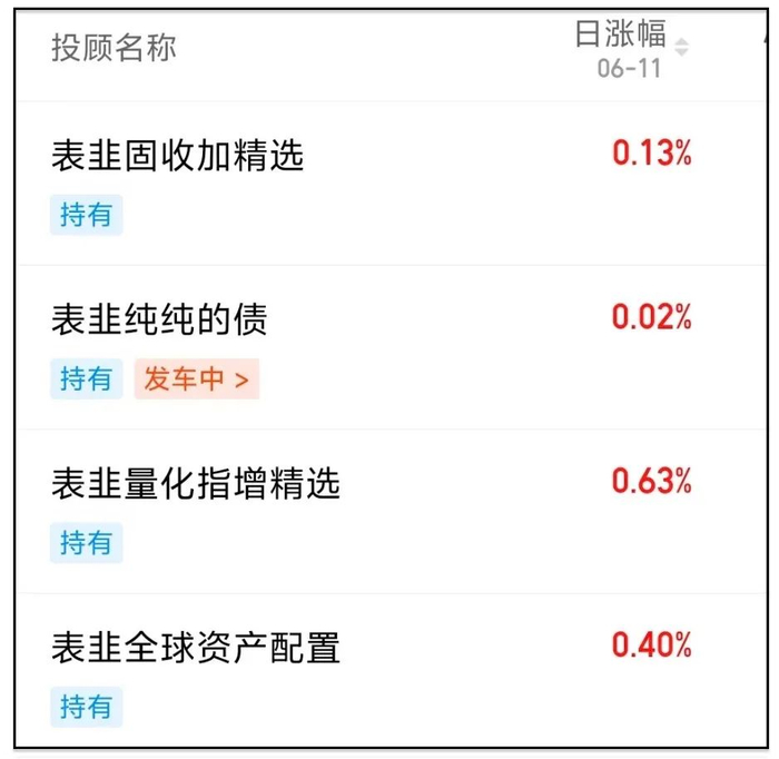 今天纯纯的债,主理人发车了,理由大家可以去天天基金、雪球,搜索“表韭”,在组合页面里看到。