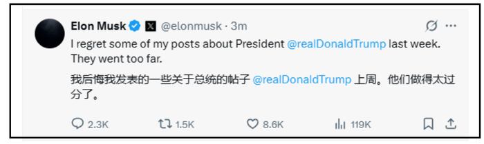 之前就说过,两人撕破脸再和好,也是大概率的事件,毕竟马斯克本人是真的MAGA,而且其背后也代表了一部分川宝的票仓,所以和好才是最优解。