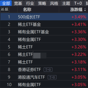 市场的表现,应该来说,是相当强劲的,下图,是今天ETF涨幅榜的前十,排第一的属于小规模产品的异动,可以剔除,剩下涨幅靠前的,主要是稀土、港股券商、以及港股通汽车,这其实也代表着今天市场上涨过程中,最重要的三件事,依次简单聊聊。