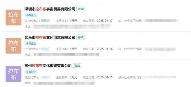 在社交平台上,因做工粗糙导致“鼻歪眼斜”的盗版LABUBU被网友戏称为“LAFUFU”“LAGOGO”。企查查信息显示,“LAFUFU”“LAGOGO”“LABABA”等衍生名称已被多家企业注册为商标,国际分类涉及广告销售、办公用品等,申请人多包括贸易公司、服装公司等。值得注意的是,多家新成立公司以“拉布布”命名,包括杭州拉布布文化传媒有限公司、浙江拉布布纺织科技有限公司、深圳拉布布商务有限公司、东莞市拉布布玩具有限公司等。
