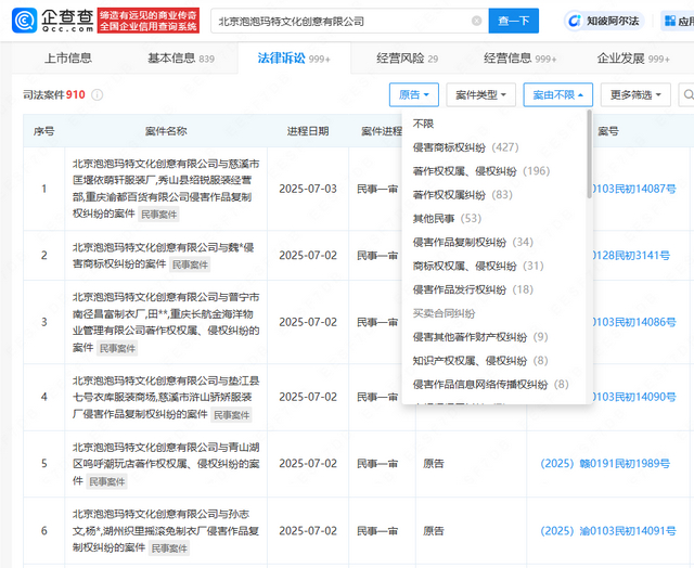 在知识产权方面,企查查数据显示,北京泡泡玛特文化创意有限公司已申请注册80余枚“LABUBU”“拉布布”相关商标,已登记《LABUBU 与朋友们》动画剧集第一季剧本V1、Mini LABUBU Open Skies 手办、LABUBU Bao手办等1500余项作品著作权。此外,泡泡玛特当前关联近千起案件信息,其中900余条原告为泡泡玛特,案由多为商标权纠纷、著作权纠纷、作品复制权纠纷等。