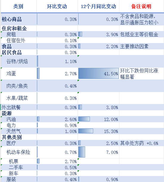 分区域看,东北部上涨 2.8%,中西部上涨 2.4%,南部上涨 2.0%,西部上涨 2.4%。大城市(如纽约、洛杉矶)CPI 涨幅高于中小城市。