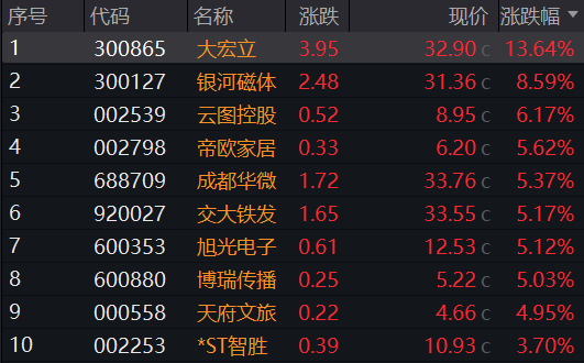 从川股表现看,大宏立以13.64%的涨幅成为四川板块涨幅榜首位,此外,川内多个装备制造领域的个股当天纷纷上涨,受资金关注度高。与之形成鲜明对比的是,前期备受关注的高标人气股尚纬股份、金时科技则遭遇跌停,市场热点切换迹象明显。
