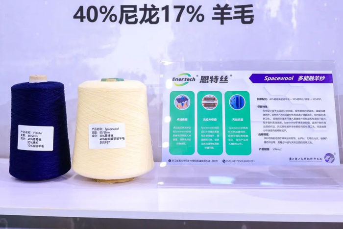 浙江理工大学桐乡研究院有限公司主推一种全新的“纶材料”--恩特丝纤维(改性涤纶),依托分子结构设计与原位嵌入聚合尖端技术,实现抗菌、远红外、负氧离子、轻量化、亲水抗静电等多功能,一般加入10%-15%可以做成复合纱即具有导电性能,可应用于运动系列、保暖内衣等。同时还展出了抗起球短纤、抗老化超细旦PLA、原液着色 PLA 纤维等差异化研发创新成果,并推出高性能纱线、功能面料及成衣,提供从材料研发、产品设计到成品制造的一站式高端解决方案。