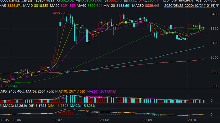 下图为2020年5月22日至2020年10月21日之间上证指数走势(共101日),区间即是上述中芯国际、九号公司红筹股回A紧锣密鼓推进时期。可以看出,上证指数从2800点附近一路上攻,至当年7月9日最高摸至3458.79点,之后经历了长达三个月的相对高位横盘,一直运行在3000点上方。