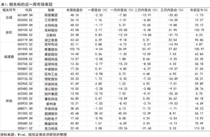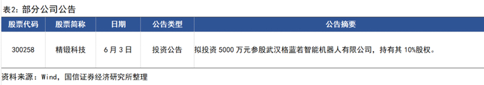 市场表现:本周(6.2-6.6)我们构建的国信人形机器人指数上涨1.2%,弱于沪深300指数0.32pct,弱于上证综合指数0.07pct,年初至今上涨9.8%。拓普集团下跌2.33%,三花智控上涨1.16%,中鼎股份上涨0.41%,银轮股份上涨1.73%,北特科技下跌1.17%,双林股份上涨3.17%,贝斯特上涨0.83%,浙江荣泰上涨6.29%,祥鑫科技上涨4.85%,双环传动上涨0.88%,斯菱股份下跌4.54%,豪能股份上涨0.56%,精锻科技下跌2.58%,蓝黛科技下跌2.77%,凌云股份下跌2.28%,旭升集团上涨13.75%,肇民科技上涨5.67%,爱柯迪下跌1.55%。均胜电子下跌0.96%。征和工业下跌0.98%,美力科技上涨3.08%。