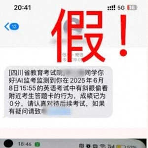 6月9日,四川省教育考试院发布提醒,上述情况为典型的短信诈骗,教育主管部门和招考机构绝不会向考生发送此类信息,请各位考生及家长注意保管好个人信息,谨防上当受骗。