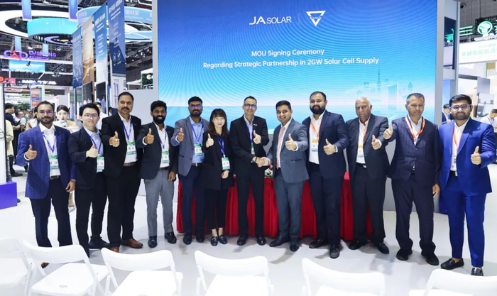 展会现场,晶澳科技与KNACK ENERGY共同签署2GW电池供货MOU协议,此次合作不仅体现了双方在全球能源转型中的坚定承诺,还将推动印度本土光伏制造能力的发展。