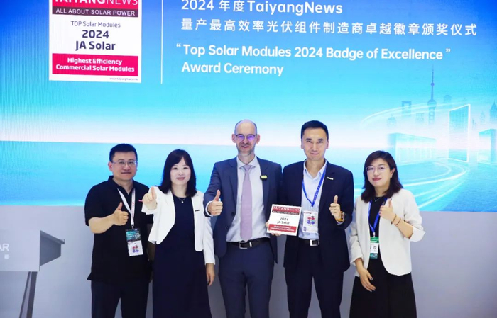 展会现场,TaiyangNews常务董事Michael Schmela为晶澳科技颁发了“量产最高效率光伏组件制造商卓越勋章”。该勋章在全球范围内具有极高的专业性与影响力——TaiyangNews自2022年开始发布量产组件效率排名,并随之推出了“卓越勋章计划”。根据该计划,如果一款产品在当年至少有6个月位列TOP SOLAR MODULES榜单TOP10,且该产品已实现量产供货,制造商方可获得卓越勋章。