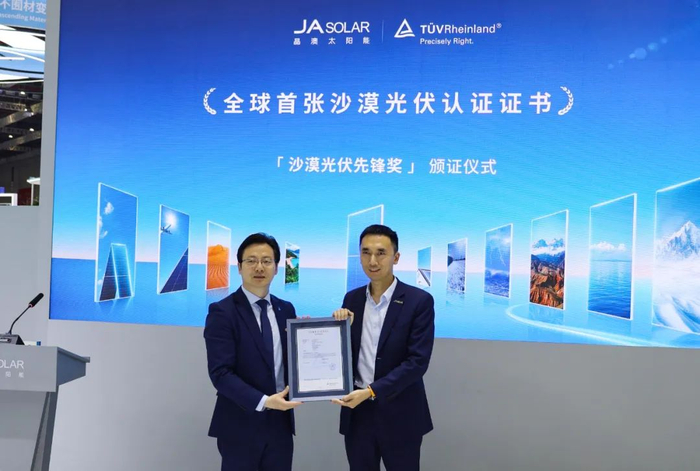 晶澳科技作为“全场景”解决方案的领军者,已率先向这项全新认证标准发起挑战,并顺利通过所有测试项目。在展会现场,T V莱茵全球电力电子产品服务副总裁兼大中华区太阳能与商业产品服务总经理李卫春亲手为晶澳科技颁发了全球首张“沙戈荒光伏组件认证”证书,彰显了晶澳科技对于沙漠应用场景的强大掌控能力。