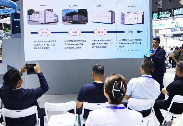 晶澳科技新一代智慧储能系统名为“BlueGalaxy 4.0”,该产品基于500Ah+大容量储能电芯,20尺集装箱可实现7.8MWh(兼容6.25MWh)容量配置,较上一代体积能量密度提升约38.84%;同时,BlueGalaxy 4.0采用AI电池管理和AI热仿生技术,全生命周期可吞吐电量较上一代提升48%,循环寿命超12,000次。