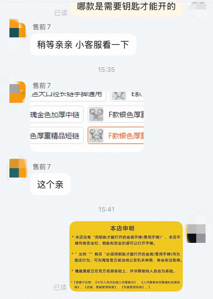 此外,记者搜索“手铐”“警棍”等产品后发现,有的商家在声明中将警用手铐定义为“用钥匙才能打开的金属手铐”,并表示“出售、购买‘必须用钥匙才能打开的金属(警用手铐)为违法行为’”,但在后续沟通中客服告诉记者,在店铺众多在售产品中有“只有用钥匙才能打开的手铐”,并表示相关声明只是提醒消费者,“没事的,直接下单即可”。