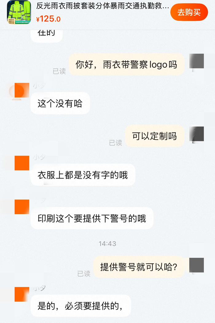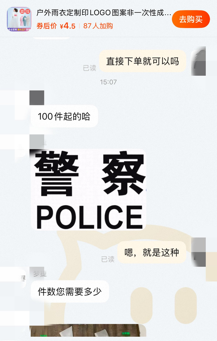 在与客服人员的沟通中,记者发现,大多数商家支持在相关产品上定制印字,不少网店都表示可以加印“警察”字样。一家网店客服表示可以印刷,但需要脱离平台通过微信发送定制图片;有的客服人员要求记者提供警号,并表示“不需要其他证明材料”,有的客服人员表示需要由记者提供授权书等材料后可加印;还有商家表示不能加印“警察”字样,但可以添加“执勤”“特勤”等字样,在沟通过程中,客服并未索要能够证明警察身份的证件。