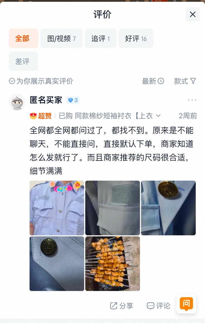 随后,记者在多家电商平台上搜索“保安服、保安配件”等关键词,有些商品在详情页面的图片上标注着“同款正品配发”“后勤采购、定点厂家”等,评价页面的买家秀图片中有“警察”字样,客服则表示“不要发任何图片和特殊字眼,配合流程购买”,并指引添加微信私下交易,记者注意到,有买家在评价中写“不能聊天,不能直接问,直接默认下单,商家知道怎么发就行了”。
