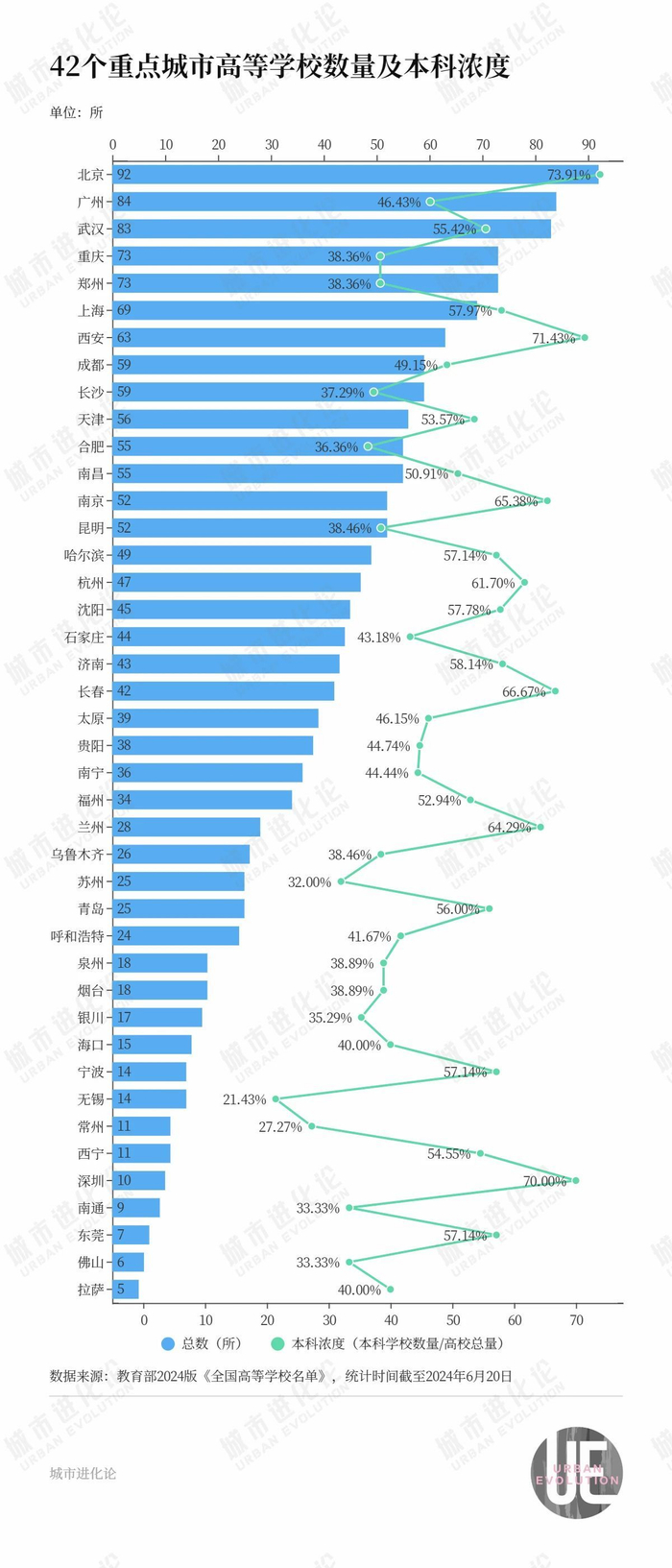 根据此前教育部公布的名单,截至2024年6月,全国共有普通高等学校2868所,含1308所本科、1560所高职(专科)。从城市分布来看,包括直辖市、省会城市和经济大市组成的42座重点城市集聚了全国半数高校(不含港澳台地区高校),这其中,东莞和宁波的高校数量排名均较为靠后。