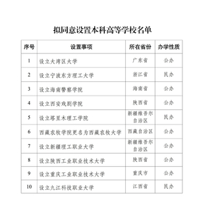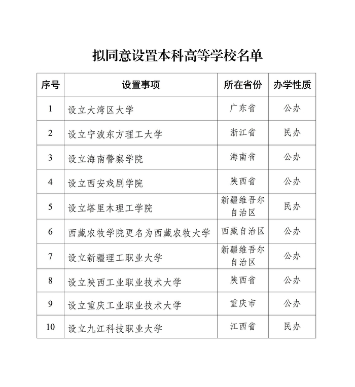6月11日,教育部网站发布“关于拟同意设置本科高等学校的公示”,根据《中华人民共和国高等教育法》《普通高等学校设置暂行条例》《普通本科学校设置暂行规定》《本科层次职业学校设置标准(试行)》等有关规定以及第八届全国高等学校设置评议委员会考察评议结果,经教育部党组会议审议,拟同意设置大湾区大学、宁波东方理工大学等10所学校,现予公示。公示信息显示,10所高校中,5所为新设院校,1所为普通本科高校更名,4所为职业本科大学。公示时间为2025年6月11日至6月17日。