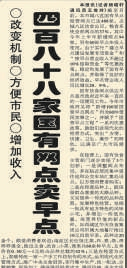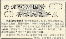 为了改变这种状况,从1995年起,东城、海淀等多区百余家国营餐馆的早点陆续回归,敞亮的环境、丰富的品种、实惠的价格,顾客们坐在大馆子里吃上放心早点,甭提多满意了。(1996年4月30日《北京日报》2版,《海淀50家国营餐馆恢复早点》)