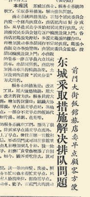上世纪五六十年代,北京的商业网点不够健全,再加上物资紧缺,人们需要排队买早点。比如宣武门内大街,原来有五六家卖早点的,后来只剩下两家,居民想买个烧饼也得排队。(1956年8月15日《北京日报》1版,《商业要更好地为生产、为消费者服务》)