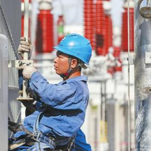 6月11日,在广元市剑阁县110千伏剑阁变电站施工现场,电力工人冒着热浪对变压器进行能效改造。 张超 摄(C视觉)