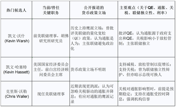 德银报告明确列出了三位热门人选:前联储理事凯文·沃什(Kevin Warsh);美国国家经济委员会主任凯文·哈塞特(Kevin Hassett);以及现任联储理事克里斯·沃勒(Chris Waller)。