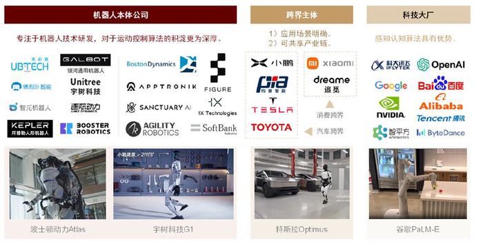 ► AI软硬件科技厂商:典型如英伟达、科大讯飞、智平方科技等。这一类厂商凭借自身在感知、认知环节的算法优势,或定位于核心算法供应商赋能机器人公司,或直接开发机器人本体。此外,很多科技大厂通过投资的方式布局具身智能,与机器人本体公司达成深度合作,如OpenAI投资1X Technology、Figure.ai,阿里投资逐际动力等。