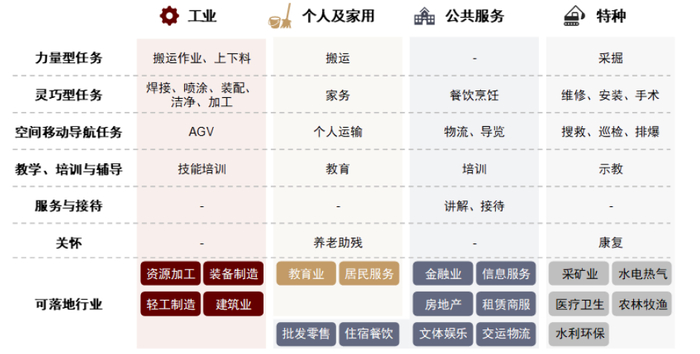 向终局展望,人形机器人可胜任多元多样的任务场景。根据中金研究院及研究部联合研究发布的《AI经济学》报告,从元任务的角度看[2],人形机器人“具身”的特点使其尤其适合力量型、灵巧型及空间移动导航等体力任务,例如上下料、维修、巡检等。同时,其“智能体”特征使其具备人的智能与情感,能够在教培辅导、服务接待、人文关怀等支持型任务中发挥作用,例如教育、讲解导引、养老助残等。大部分行业都是由多类元任务组合而成的,向终局去看,我们认为人形机器人有望在各个行业找到适合自身落地的应用场景。比如,服务业前台(营业部客户接待)、采矿业(物料挖掘搬运)、水电热气(电力巡检)、看护养老业(康养陪护)、装备制造业(工业制造)、医疗卫生业(手术机器人)、住宿和餐饮业(餐饮服务机器人)等等,不一而足。