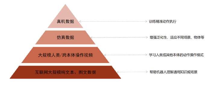 机器人“大小脑”的迭代需要海量的优质数据支撑,产业尝试采用多种方式解决机器人训练数据端的瓶颈。当前的机器人“大小脑”算法很大程度上都依赖于基于大量数据的深度学习来进行训练,大量的优质多样性数据也是机器人实现通用泛化智能的基础。类似于大规模语言模型,机器人大模型理论上也能够延续Scaling-Law,通过更大量级的数据、算力来实现更大规模参数模型的训练,并且实现更强的通用性、泛化性和“智能涌现”。由于机器人大模型的探索仍处于早期阶段,因此与其他类似的AI细分方向相比,其在训练数据方面的积累也较为薄弱。目前机器人大模型的训练数据主要有几种来源,主要可以分为真实世界数据(真机数据)、仿真数据、互联网数据几种来源。