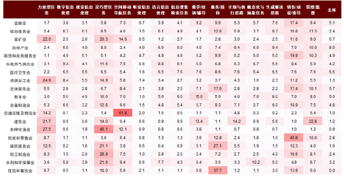 我们用元任务概念拆分各个行业生产活动,并将力量型、灵巧型以及空间移动导航三类元任务定义为人形机器人的主要应用场景。将各行业中元任务的时间分配比例,按照各行业占总就业人数比重加权后,可以得到我国劳动者在元任务上的时间分配比例。