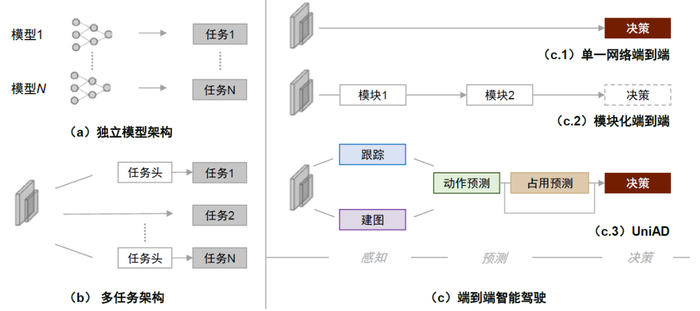 端到端:在联合优化中提升模型能力。统的分层决策框架下,感知、预测、决策、控制各个模块各司其职,智驾系统所面临的决策将更为复杂,所需的独立模型更多,且各个模块间的优化目标不一致,使得决策模块能够利用的特征空间小于传感器最初输入的特征空间,存在信息损失和误差传递问题。在这种背景下,端到端智能驾驶逐渐成为行业探索的重点。端到端技术将各个软件模块纳入统一框架,完整的特征空间可以传播至模型的各个部分,以自车作出最优的决策为最终目标,各个部分/各类任务进行联合训练和优化。此外,由于是统一的AI模型,数据闭环驱动的效率将得到提升,随着训练集的扩大,有潜力涌现出更多的模型能力。
