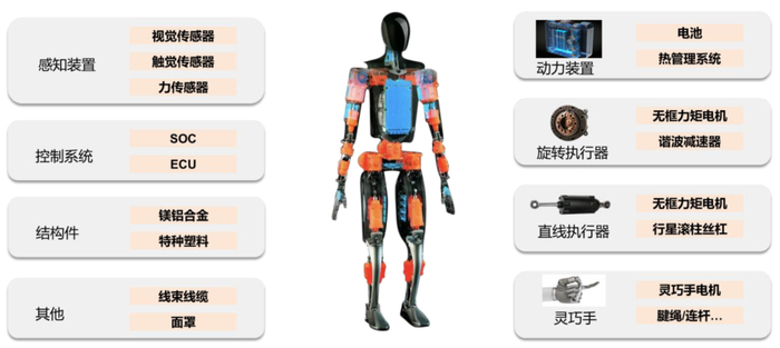 关节执行器是人形机器人的主要输出机构,决定系统的自由度与运动性能。关节执行器作为人形机器人的核心部件,分布在机器人的各大关节处,如上肢(肩、肘、腕)、躯干(腰)和下肢(髋、膝、踝)等部位,其主要功能是将动力源转化为机械动能,驱使机器人输出各项肢体动作。关节执行器的核心构成是电机和传动部件[3],此外还包括传感器和控制器,其通过电机等动力源提供的能量,经传动部件传递和调整扭矩,利用编码器、力传感器等感知部件实时反馈关节状态,保障动作的精准执行。关节执行器决定人形机器人的自由度、额定负载、工作空间、工作精度等核心参数,对运动性能产生直接影响,我们估计占硬件成本的60%以上(以特斯拉为例)。