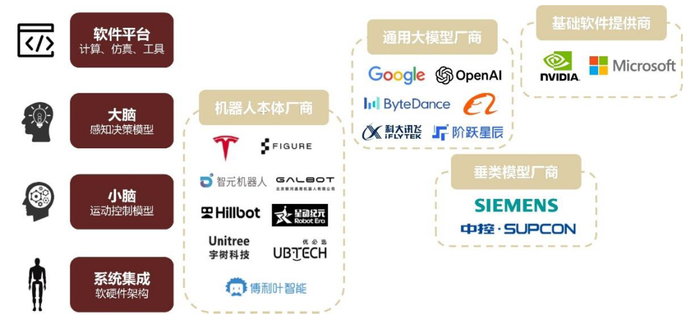 人形机器人软件产业链围绕“大小脑”为核心,数据与软件基础设施提供支撑。从机器人相关软件产业链的视角来看,实现通用泛化的机器人“大小脑”(具身智能大模型)是目前产业共同的目标,而配套的产业环节建设也都是围绕着“大小脑”来进行。机器人本体企业主导整体系统架构与“小脑”,并在“大脑”层面也持续深入探索;大模型公司则是主要以多模态模型算法赋能“大脑”;而数据作为模型训练的关键要素,同样也成为了当前机器人大模型迭代的卡点;仿真与开发平台以及配套的软件工具更是为大模型的开发搭建提供了基础设施支持。本章节在下文中将从机器人“大小脑”模型、机器人数据集、机器人软件基础设施三个角度,对人形机器人软件相关产业链进行整体性的分析。