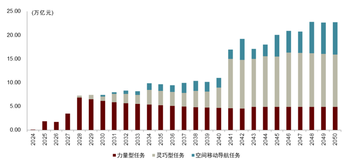 结合前文对人形机器人在各行业的渗透空间、渗透时点的假设,我们可以根据各行业(人形机器人已经具备经济性的行业)生产活动中人形机器人可从事的元任务的时间占比*该行业的总劳动时间*单位薪资,得到该行业愿意为人形机器人产品支付的总金额。我们大致估算中国人形机器人潜在市场空间有望于2050年达22.8万亿元,2024-50年CAGR达24.7%。全球范围看,若按照人口比例推算,2050年的市场空间更为广阔。