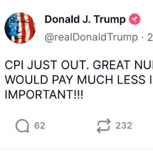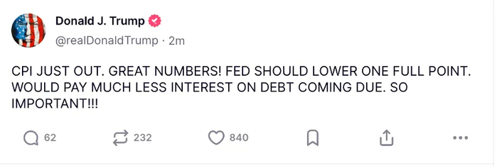 数据公布后,美国总统特朗普在社交平台发文称:“CPI数据刚刚公布,数据非常好!美联储应该降息整整1%(100个基点)。这样到期债务的利息支付就会少很多。这非常重要!”