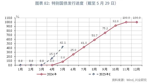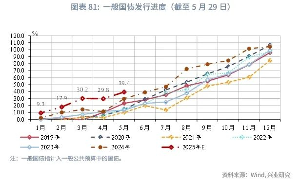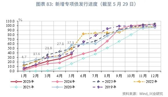 2025年1-5月政府债发债节奏相对2024年同期有所提前,特别是国债发行提速对资金端形成有力补充,后续新增专项债的提速与超长期特别国债的发行将对第二、三季度政府性基金支出形成支撑。一般国债方面,若以一般国债净融资规模占全年新增中央赤字的规模作为一般国债的进度衡量,2025年1-5月,一般国债发行进度显著高于历史同期,体现财政发力的前置。特别国债方面,2025年特别国债于4月开启发行,较2024年提前了1个月,且发行规模显著高于2024年同期。5月20日,国家发展改革委举行5月份新闻发布会,政研室副主任、委新闻发言人李超表示,“力争6月底前下达完毕今年全部‘两重’建设项目清单”[14]。其下达时点较2024年同期有所加快,预计后续将对支出形成更有力补充。专项债方面,新增专项债发行进度慢于历史平均水平,但由于2024年再融资债发行后置,2025年的发行节奏仍快于2024年。截至5月末,新增专项债发行进度约为37.1%,较2024年同期提高7.4个百分点。