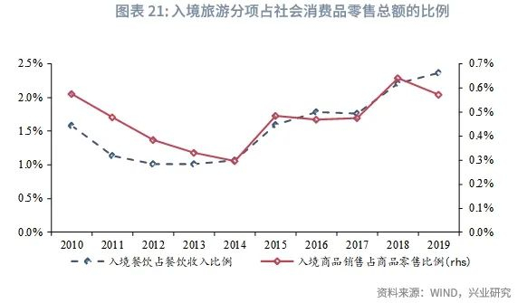 以2015-2019年均值测算,入境旅游中的商品销售约占社零口径商品零售的0.5%,入境餐饮约占社零餐饮收入的1.9%,合计约占社会消费品零售总额的0.7%左右。通过发展入境旅游,可以引入外部需求新增量,对国内消费需求形成有效补充。