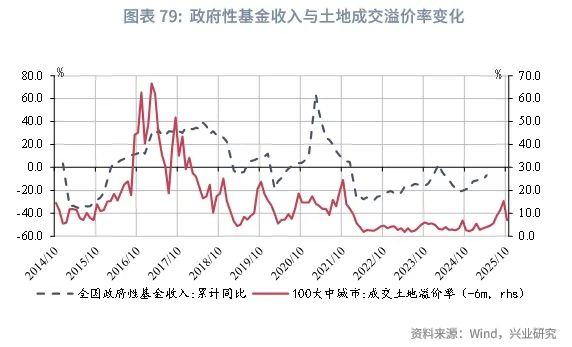 政府性基金预算收入端或面临更大的不确定性。国有土地出让收入通常依赖于商品房销售、土地溢价率的变化。2025年“小阳春”后楼市复苏遇到波折,土地收入或再次面临压力。2025年年初预算收入增速0.7%,而2025年1-4月政府性基金收入累计同比-6.7%,显著低于预算水平。但后续商品房销售的下降与土地溢价率的下滑或对收入端形成约束:一是4月商品房销售降幅有所扩大;二是100大中城市成交土地溢价率冲高回落,或拖累土地出让收入修复。尽管当前收入进度20.1%,较2024年同期高1.1个百分点,但2024全年收入进度仅为87.7%。假设全年国有土地出让收入增速约在-10%至-15%之间,国有土地出让收入占比约为78%,预计全年收入预算执行率仍将低于100%,约88%-92%。