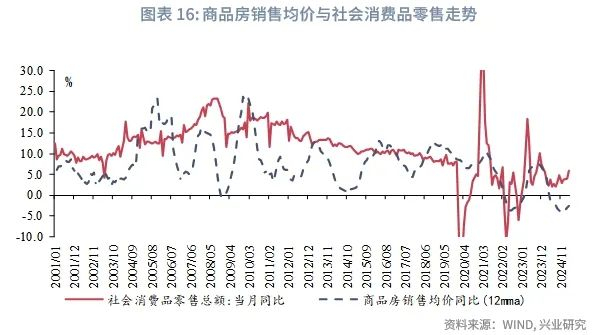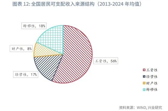 收入是居民消费能力的基础,是影响消费的基础因素。按工资性收入、经营性收入、财产性收入和转移性收入对居民可支配收入进行拆分,2014年第一季度至2025年第一季度,各分项同比与社会消费品零售总额增速之间的相关系数分别为0.86、0.76、0.48和0.42。将消费增速作为因变量,分别将各收入来源同比作为解释变量,建立单变量回归模型,各模型的分别为0.74、0.57、0.23和0.18;将所有收入来源置于多变量回归模型中,仅有工资性收入和经营性收入变量显著。