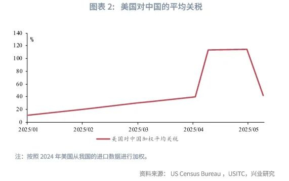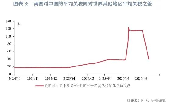 特朗普第二次上任以来,美国大幅调整对华关税政策。2025年2月1日美国以芬太尼问题为由对所有中国产品加征10%关税。2025年3月3日,美国将“芬太尼关税”上调至20%。2025年4月2日,美国宣布对全部贸易伙伴征收“对等关税”,其中对中国“对等关税”征收税率为34%。此后又以中国实施反制措施为由,肆意提高对华税率。在2025年5月12日中美达成经贸协议,中美双方大幅调低相互关税。在协议初始90天内,特朗普第二任期累计对华加征的关税由145%下降至30%(20%“芬太尼关税”+10%“对等关税”)。当前,美国主要针对中国加征的关税包括301关税、20%“芬太尼关税”、10%的“对等关税”、54%(或每件100美元)的低值小包商品关税。综合以上关税税率,并使用2024年美国从我国的进口数据进行计算,当前美国对我国进口产品的加权平均关税约在41%左右。在中美达成贸易协议后,我国相对世界其他地区面临的美国关税水平回到了2025年3月,即美国对华加征“芬太尼关税”后、加征“对等关税”前的水平,较特朗普第二次上台前高出20%。