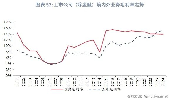 从盈利空间来看,国外业务的毛利率已经高于国内业务。本文使用全部A股上市公司(不含金融)的国内/国外毛利除以国内/国外收入,分别计算国外业务的毛利率。自2001年起,上市公司国外业务毛利率整体低于国内业务,但2016年以来国内毛利率开始缓慢下滑;2023年国外业务毛利率开始超过国内业务;2024年,两者差值进一步放大。对于企业而言,若近年国内利润不及国外利润,意味着出口遇到贸易壁垒后若转内销,盈利难度将更大。