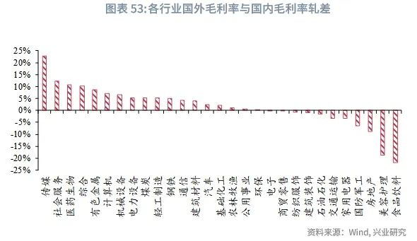 以2024年情况作为基准,不同行业出口转内销面对的局面不同。若不考虑国内市场容量,仅考虑利润率的差异,生物医药国外业务利润显著好于国内业务,毛利润差值高达11%;有色金属、计算机、机械设备、电力设备、轻工制造、钢铁行业的国外毛利率比国内毛利率高出5%及以上,上述行业出口转内销的难度更大;建筑材料、汽车、基础化工的国外毛利率略高于国内,寻求内销替代的过程中盈利或受到压缩。电子行业国内外毛利率较为接近,向国内市场迁移对于利润的影响整体较小。相比之下,食品饮料、家用电器、服装服饰的国内毛利率分别比国外毛利率高出22%、3%和1%,有一定的转内销空间。