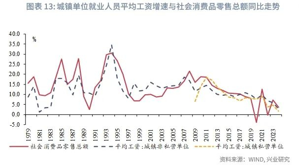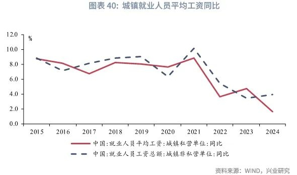 作为影响消费最重要的收入来源,近年来平均工资增速有所回落。2025年5月,国家统计局公布2024年城镇单位就业人员平均工资,非私营和私营单位工资增速分别较2023年下降3.0个和3.1个百分点录得2.8%和1.7%。受工资性收入增速回落影响,消费增速亦有下降。