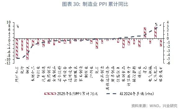 一是制造业PPI跌幅仍在扩大。2025年1-5月全部工业品PPI累计同比较2024年下降0.4个百分点至-2.6%,各制造业PPI累计同比的均值为-1.7%,较2024年12月的-1.3%进一步扩大0.4个百分点。PPI的持续负增或压制盈利预期,从而降低企业的投资意愿。服装纺织、制鞋业、汽车制造等投资增速较快的行业,其PPI增速在2025年前5月较2024年进一步下降,且利润增速为负,上述制造业投资后续或难以维持当前的高增长。