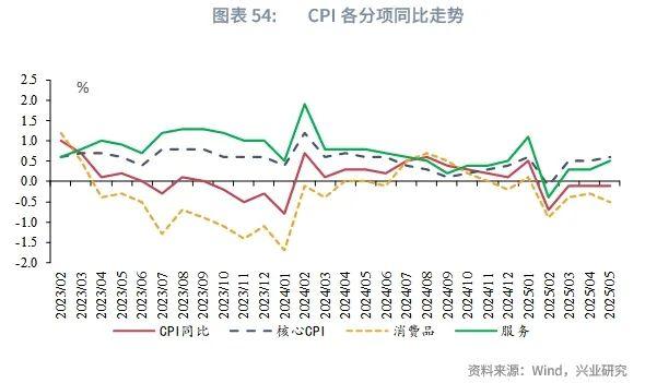 租金方面,2019年以来,二手房销售价格对于房租CPI具有一定的领先性。自2024年9月楼市提振政策出台以来,房价回暖带动房租CPI同比跌幅收窄;2025年4月以来,政策效应有所退坡,楼市修复出现波折。下半年若楼市复苏动力走弱,房租CPI同比跌幅或再度走阔。