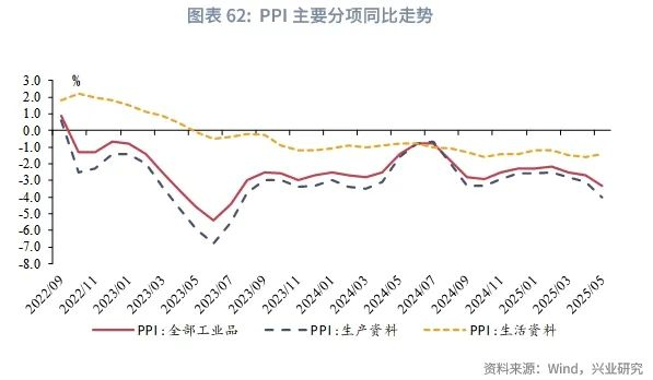 2022年第四季度以来,生产资料价格同比增速整体低于生活资料价格,仅在2024年6-7月出现短暂反转;2025年1-5月,生产资料价格同比跌幅有所走阔,对PPI的构成拖累。