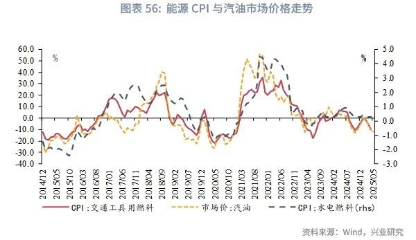 能源价格主要影响CPI中的交通工具用燃料以及水电燃料分项,集中体现为汽油价格。国内汽油价格很大程度受国际原油价格的影响,参考兴业研究外汇商品部观点,下半年布伦特原油价格或在60-68美元/桶区间波动[13],中枢相较2024年下半年价格中枢77.7美元/桶同比下跌17.6%,同比跌幅略大于上半年的14.7%。油价回落对整体CPI的拖累作用仍将持续。