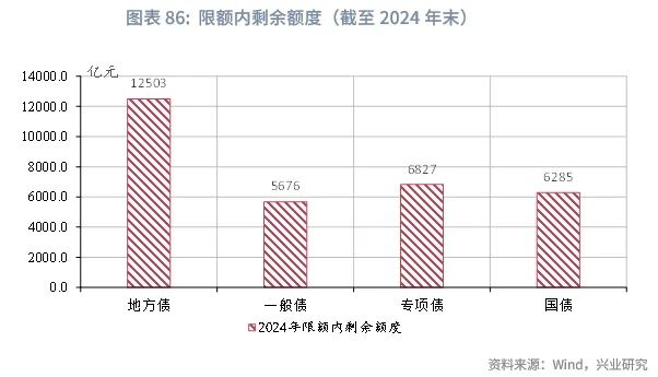 需要注意的是,美国关税政策仍有较大的不确定性,基准情况下,财政政策可以通过调节全年支出节奏、盘活历史额度、运用好新增的政策性金融工具等方式,平滑全年支出节奏,支持下半年经济增长。如果对等关税豁免期持续到8月,使抢出口延续到第三季度,则经济增长压力将后移。2025年上半年GDP增速有望超过5%,完成全年增长目标的压力减轻,则追加赤字的必要性较低,可以通过平滑全年支出节奏、盘活历史额度、增加政策性金融工具等方式加强逆周期调节。从历史留存的政策空间来看,国债方面,中央限额内剩余额度约0.6万亿元,地方债方面,全国限额内剩余额度约1.2万亿元(不含2025-2026年新增的4万亿元化债额度),其中,一般债剩余0.5万亿元,专项债剩余0.7万亿元。2025年4月25日的政治局会议提出“既定政策早出台早见效,根据形势变化及时推出增量储备政策,加强超常规逆周期调节”。如果关税出现超预期变化,增长压力加大,则可能调增全年政府债发行规模。